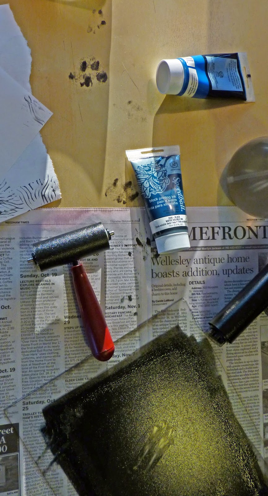 But despite her apparent reluctance to be a model, Talia has managed to participate in the printmaking in a more hands-on way. Yes, I really ought to say “paws-on.” In the midst of a block she jumped onto my table, right into the middle of the ink plate. Startled, she ran off over the table, along the windowsill, and across the floor, leaving her own trail of relief prints behind her. I know I always say I encourage everyone to make block prints, but I draw the line at printing
